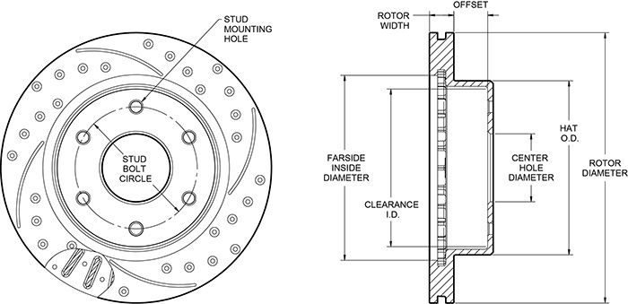 160-15785-BK – Wilwood SRP Rotor & Hat – 309x28mm Curved Slotted & Cross Drilled Left SRP rotors provide high performance, longevity and an excellent balance of efficient cooling and lower rotating mass for a wide range of applications, such as high performance, sport driving & competition use. Wilwood’s modern manufacturing capabilities allow for quality cast rotors from premium grade, long grain carbon iron for long wear, high thermal stability, and resistance to distortion at an affordable price. These rotors also offer smoother operation thanks to precision turned faces with less than .001″ variation in parallelism, flatness, or run-out.