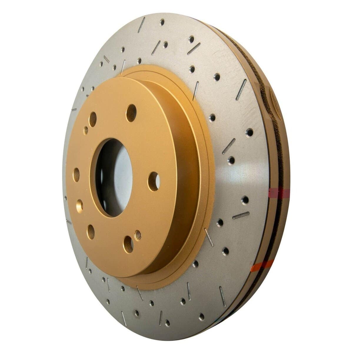 DBA42010XS – 4000 Series XS Gold Brake Rotor; Front The 4000 Series XS Gold brake rotors provide all the benefits of 4000 Series, with a premium non directional cross drilled and slotted design, including an appealing gold coated finish on the rotor hub. The implementation of the distinctive cross-drilled and slotted design enhances the number of exit points, facilitating the efficient release of brake pad friction dust and gases through both the cross-drilled holes and slots, thereby improving braking performance. Most of DBA’s 4000 Series Brake Rotors feature the revolutionary Kangaroo Paw ventilation system. This system incorporates a pattern of 144 diamond and teardrop-shaped pillars, resulting in an impressive 30% increase in surface area and a notable 20% improvement in cooling efficiency compared to traditional straight vane designs. Moreover, all 4000 Series Brake Rotors come equipped with Thermographic heat paint markings. These markings change color at specific temperature thresholds, offering a useful visual indicator for monitoring braking temperatures and assessing rotor fatigue. Offering comparable performance advantages to the T3 slot, the XS Gold presents a favored alternative, particularly well-received in show car applications. However, it’s important to note that drilled rotor configurations are not advisable for rigorous off-road or track day usage.