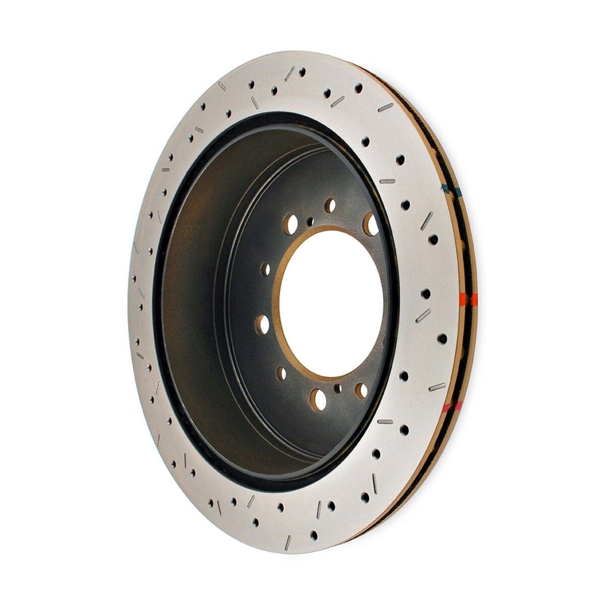- The implementation of the distinctive cross-drilled and slotted design enhances the number of exit points, facilitating the efficient release of brake pad friction dust and gases through both the cross-drilled holes and slots, thereby improving braking performance.