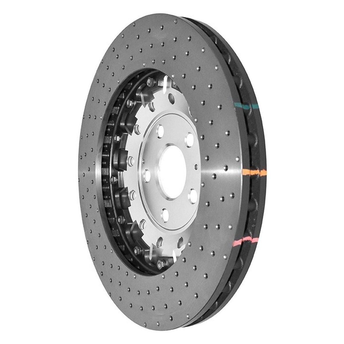 DBA52842SLVXD – 5000 Series XD Brake Rotor; Front Presenting the DBA 5000 Series XD Brake Rotors, showcasing a non-directional cross-drilled and dimpled design. The XD finish not only enhances cooling benefits beyond the HD finish but also elevates the sports aesthetics. This advanced design incorporates a mix of dimples and drilled holes, providing enhanced structural support compared to traditional cross-drilled techniques, underscoring DBA’s commitment to cutting-edge technology. The rotors feature two-piece direct replacement construction with CBN machine-turned finishes and a high carbon alloy composition. Taking performance to new heights, DBA’s Kangaroo Paw ventilation system delivers a remarkable 30% increase in surface area and a 20% improvement in cooling efficiency compared to conventional straight vane designs. Moreover, these rotors are equipped with Thermographic heat paint markings, transitioning in color at specific temperature thresholds. This visual cue allows for monitoring braking temperatures and assessing rotor fatigue, ensuring precision performance. The integration of aerospace-grade aluminum not only reduces unsprung weight but also facilitates uniform radial disc expansion within the cast iron rings. Additionally, it acts as a heat barrier, preventing heat transfer from the disc to the hub through the aluminum hats. The high carbon cast iron rings seamlessly integrate with Aluma-lite center hats/bells, securely fastened together using National Aerospace Standards (NAS) bolts and crimp nuts. Choose from complete assemblies for initial replacements or opt for replacement hats and flat disc rotors, providing flexibility and cost-effectiveness. While the DBA 5000 Series XD represents an overall improvement over the 5000 Series HD rotors, it is worth noting that XD drilled rotor configurations are not typically recommended for heavy street or track use.