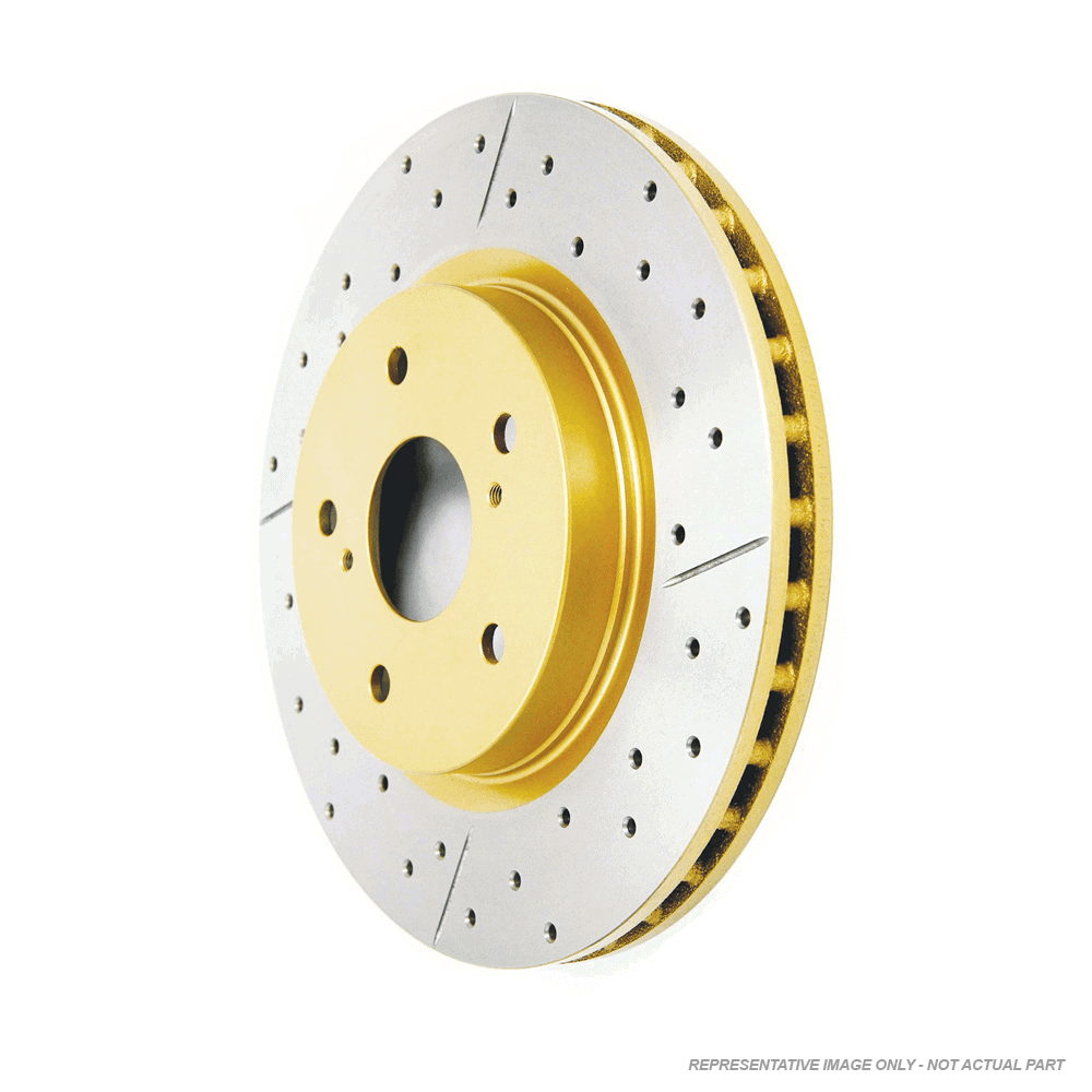 DBA573X – Street Series XGold Brake Rotor; Front DBA’s X Gold rotors offer all the advantages of the Street Series but feature a premium non-directional cross-drilled and slotted design along with an appealing gold finish on the rotor hub. The distinctive cross-drilled and slotted design in the Street Series X Gold enhances brake performance by increasing the number of exit points, facilitating the escape of brake pad friction dust and gases through both the cross-drilled holes and slots. DBA Street Series rotors stand as the optimal selection for drivers aiming for OE-level performance improvement. These rotors boast enhanced heat transfer and thermal efficiency, achieved through center-split core castings. The use of a Cubic Boron Nitride (CBN) machine-turned finish minimizes disc thickness variation, preventing pad “knock” and ensuring prolonged durability. Designed as direct OE replacement disc rotors, the Street Series distinguishes itself with superior manufacturing processes, premium materials, and proven safety features, supported by over 40 years of braking expertise from DBA. Although delivering a performance benefit similar to the T2 slot rotors, DBA Street Series X Gold rotors are a favored choice for show cars, adding a touch of style to the braking system.