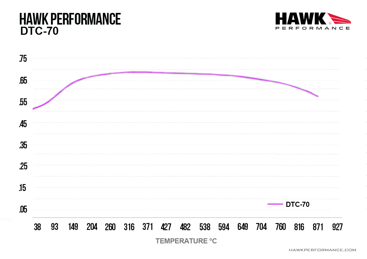 HB603U.616 – Hawk DTC-70 Brake Pads; Front The Hawk DTC-70 is more aggressive than the DTC-60 but has the same temperature range. Many racers of Corvettes, Mustangs, Porsches, BMWs and other specialty race cars choose to run DTC-70 Front and DTC-60 rear. It really is a winning race solution on its own or as split friction with the DTC-60. Operating temperatures: 205-870°C Optimal temperature range: 425-650°C