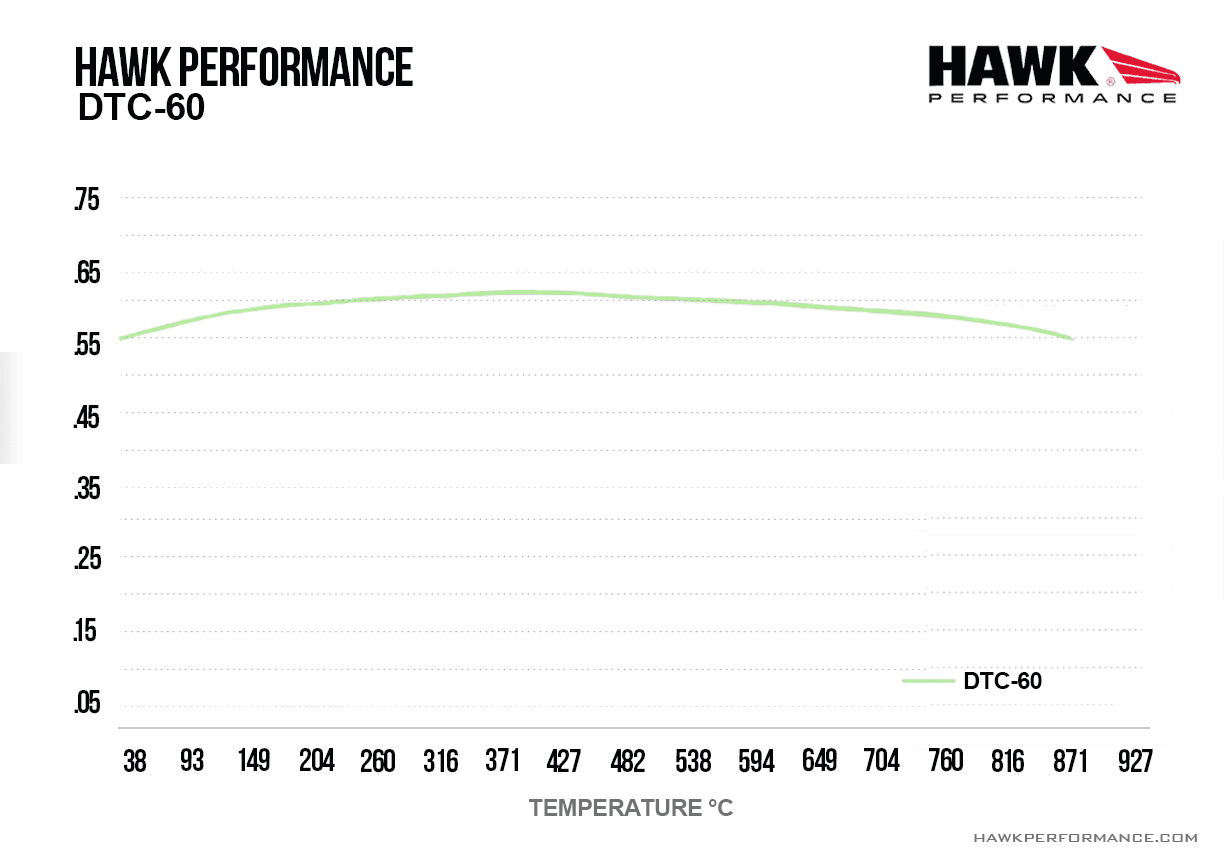 HB936G.622 – Hawk DTC-60 Brake Pads; Rear Hawk DTC-60 racing brake pads have the same temperature range as Hawk’s DTC-70, but produce less brake torque. Many racers of lighter, smaller cars often run DTC-60 pads on the front and DTC-30 pads on the rear while on larger, heavier, high performance or race cars, the DTC-60 is more often used on the rear with the DTC-70 up front. Operating temperatures: 205-870°C Optimal temperature range: 370-595°C