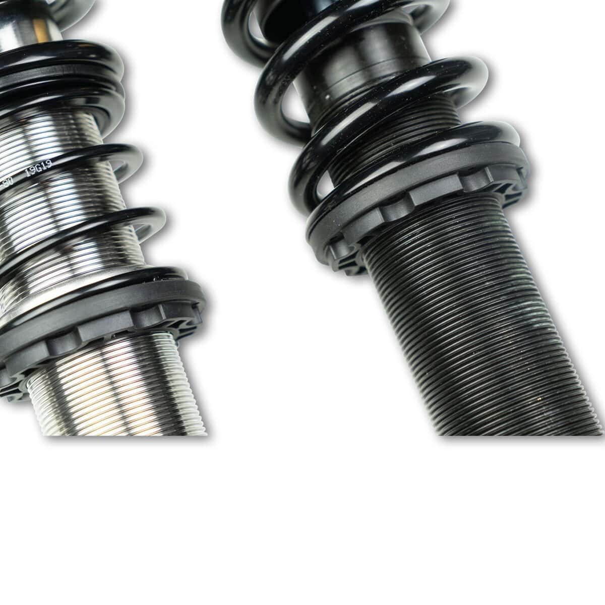 Therefore the operation of the continuous lowering via the dirt-resistant KW trapezoid thread and the KW composite collar is also not affected after years. By the individual lowering with its continuous adjustment range, you can emphasize the sportiness of your vehicle visually. A feature that is very popular in the performance-oriented tuning scene.