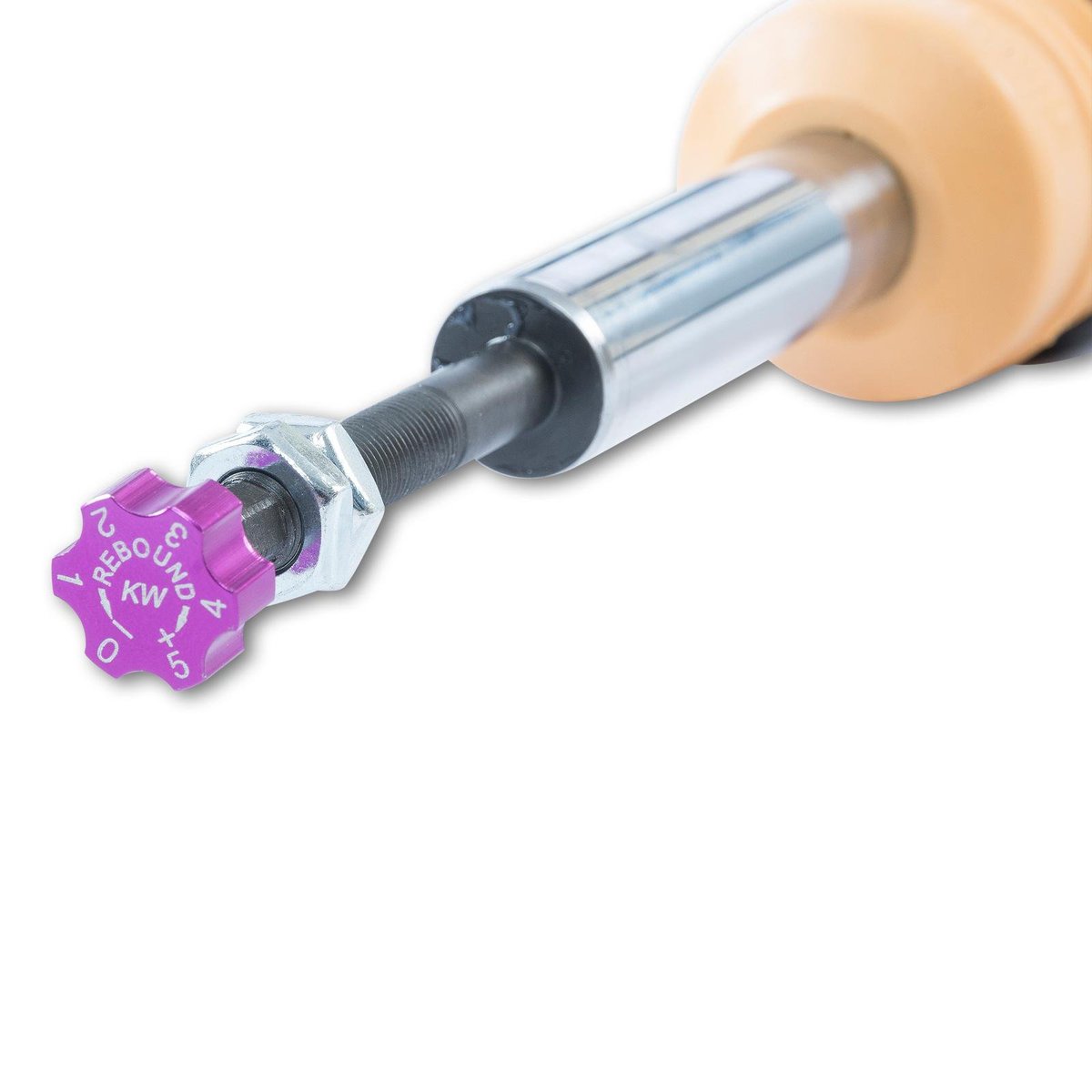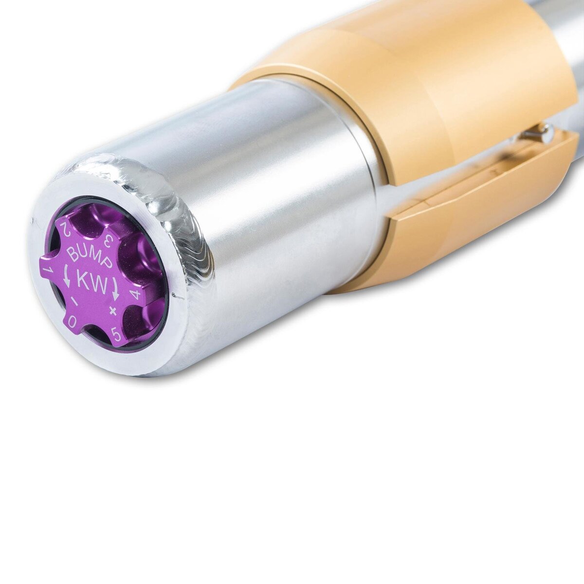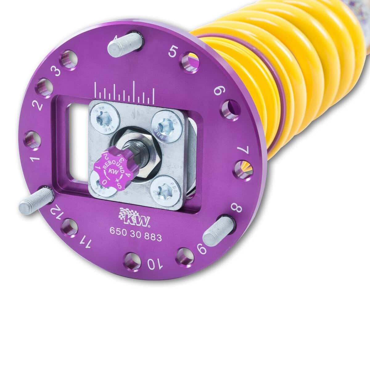 The KW V3 Clubsports and KW V4 Clubsport provides the user numerous adjustment settings. This allows to user to dial the suspension setup to his/hers driving style and to adjust or match the tire/wheel setup of the vehicle. Depending on the vehicle, we also offer Clubsport suspensions in an inverted monotube design. In this case, the piston rod is on the bottom. This inverted design provides more precise steering and greater stability and safety. This is especially beneficial for cars that are exposed to high lateral forces on the track.