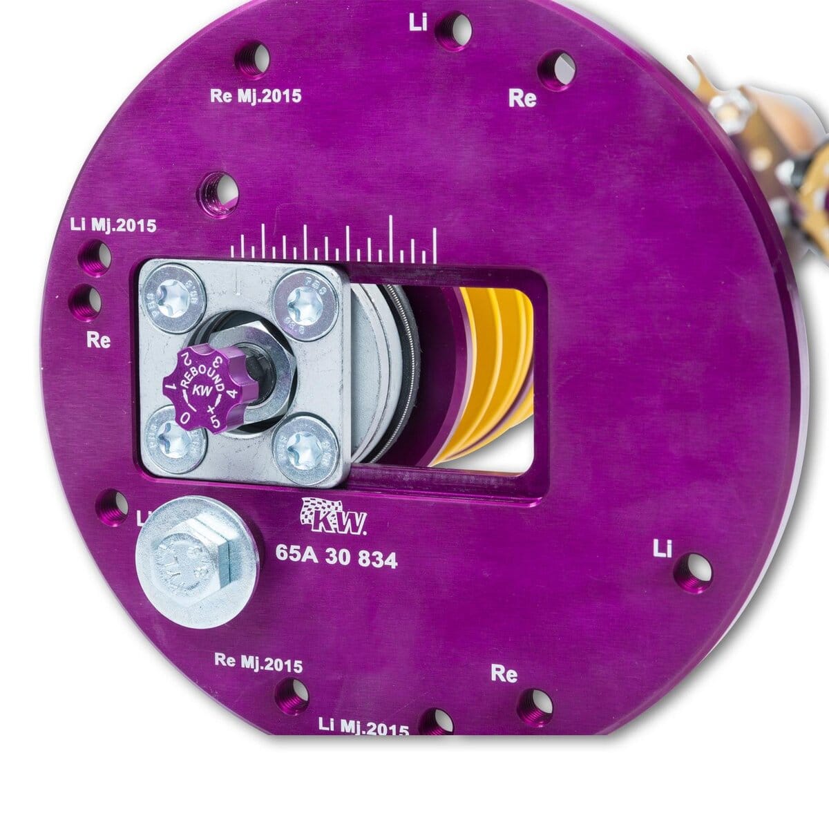 Adjustments are made intuitively via the distinctive purple and gold adjustment wheels mounted directly on the external reservoir. This allows precise tuning of the damper setup to match wheel loads, vehicle weight, and any structural changes (e.g. from bolted roll cages or reinforced chassis).