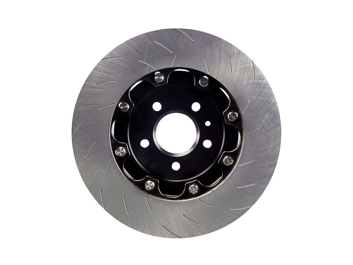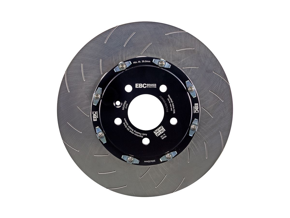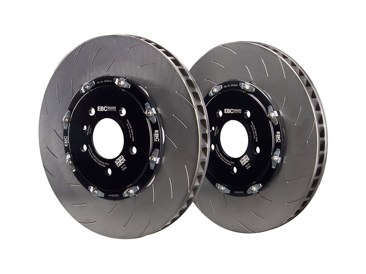 SG2F003 – EBC SG2F 2-Piece Slotted Brake Discs; Front EBC’s 2-piece fully floating rotors have been tested to withstand hundreds of hours the harshest track driving. EBC’s 2-piece rotors offer a significant weight saving compared to similar sized brake rotors leads to improvements in acceleration, ‘dive’ under braking, and tyre road holding. All cast iron rings feature 48 curved vanes and are handed left and right, ensuring the vanes always rotate in the correct direction, giving maximum cooling efficiency. All outer friction rings are cast from a high-copper, high-carbon G3500 disc alloy giving them a high resistance to wear and cracking, even when used on track or for racing. The cast iron outer ring ‘floats’ on EBC’s patented SD-Drive technology bobbins, allowing the friction ring to expand and contract freely by up to 3mm when subjected to the extreme heat generated from hard braking. The bells are precision machined from aerospace grade aluminum then hard anodised for great looks and excellent durability. All bobbins are machined from a single piece of stainless steel, preventing unsightly corrosion and ensuring the outer ring continues to float freely, even after years of exposure to road elements. EBC Racing’s 2-piece floating discs offer a low maintenance solution that are at home on both the public roads and the race track. Each bobbin location also features an anti-rattle spring clip, meaning these discs are totally silent in operation.