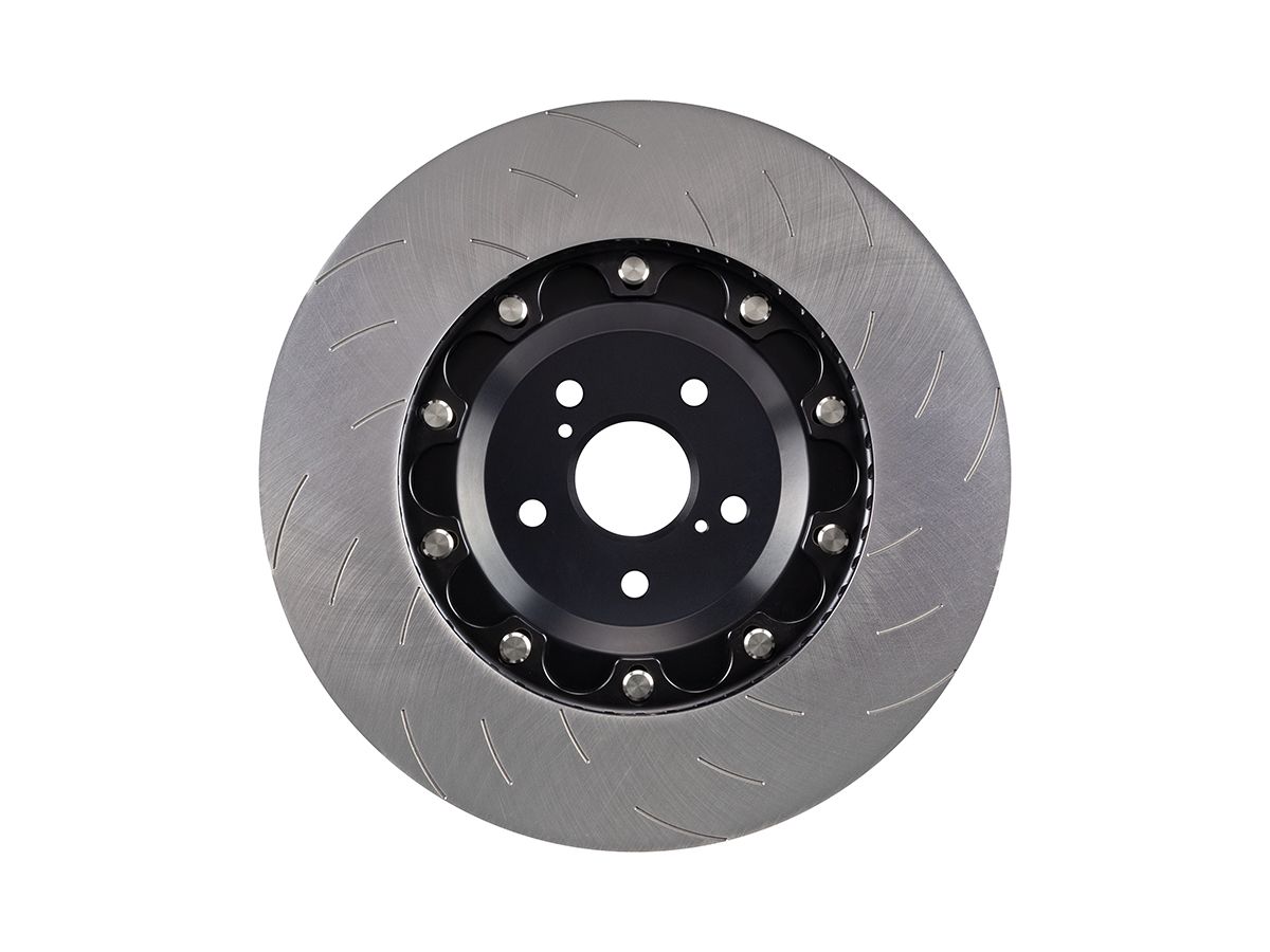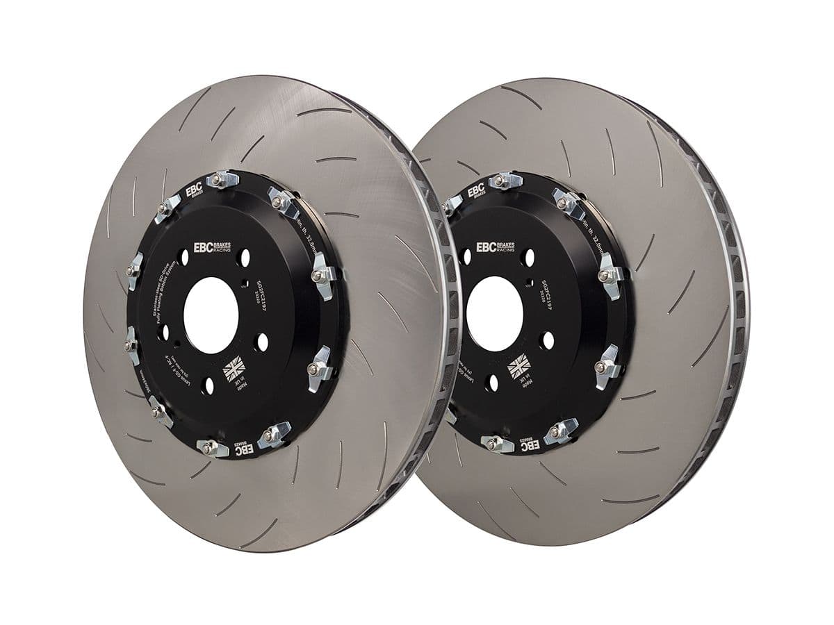 SG2FC2197 – EBC SG2FC 2-Piece Slotted Brake Discs; Front EBC’s 2-piece fully floating rotors have been tested to withstand hundreds of hours the harshest track driving. EBC’s 2-piece rotors offer a significant weight saving compared to similar sized brake rotors leads to improvements in acceleration, ‘dive’ under braking, and tyre road holding. All cast iron rings feature 48 curved vanes and are handed left and right, ensuring the vanes always rotate in the correct direction, giving maximum cooling efficiency. All outer friction rings are cast from a high-copper, high-carbon G3500 disc alloy giving them a high resistance to wear and cracking, even when used on track or for racing. The cast iron outer ring ‘floats’ on EBC’s patented SD-Drive technology bobbins, allowing the friction ring to expand and contract freely by up to 3mm when subjected to the extreme heat generated from hard braking. The bells are precision machined from aerospace grade aluminum then hard anodised for great looks and excellent durability. All bobbins are machined from a single piece of stainless steel, preventing unsightly corrosion and ensuring the outer ring continues to float freely, even after years of exposure to road elements. EBC Racing’s 2-piece floating discs offer a low maintenance solution that are at home on both the public roads and the race track. Each bobbin location also features an anti-rattle spring clip, meaning these discs are totally silent in operation.